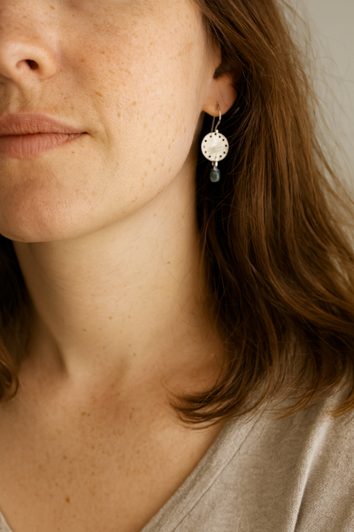 Boucles d'oreilles en plaqué or jaune ou argent de 10 mm montées avec une goutte Aigue-marine,  calcédoine verte ou onyx noir .