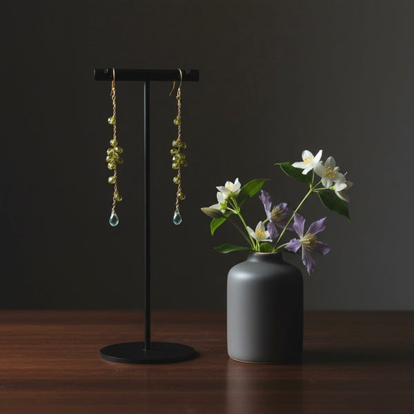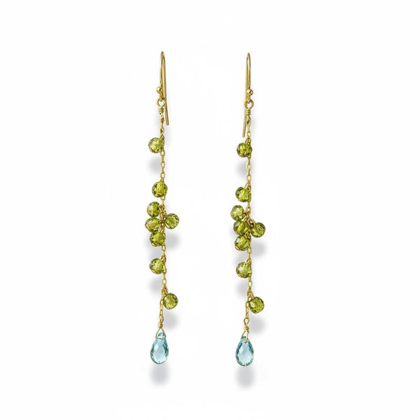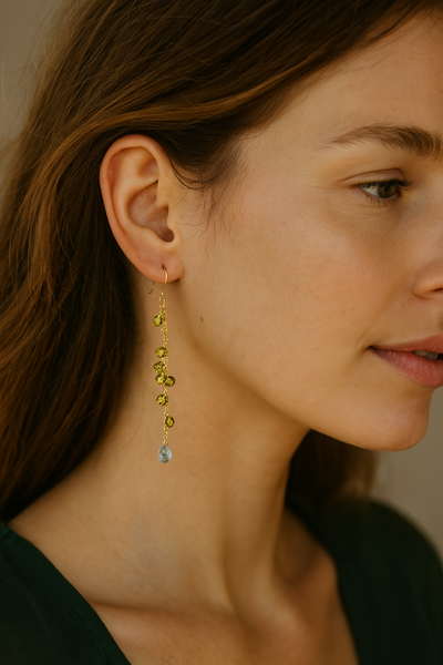 Boucles d'oreilles en plaqué or montées avec des zircon en rondelles et une goutte Aigue-marine